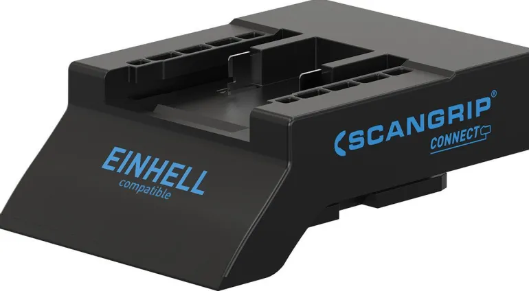 Scangripin CONNECTOR-adapteri, joka mahdollistaa Einhellin 18V/20V-akkujen yhdistämisen Scangripin CONNECT-sarjan työvalaisimiin. Scangrip on kehittänyt oman adapterin jokaiselle suuremmalle tuotemerkille mahdollistaen tuotemerkin 18V/20V-akkujen yhdistämisen Scangripin CONNECT-sarjan työvalaisimiin.