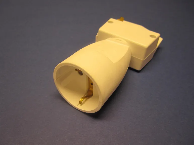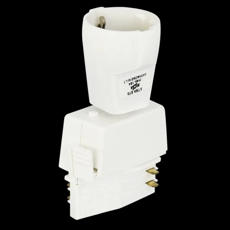 Adapteri, jossa on maadoitettu Schuko-liitäntä. Valkoinen kansi.
