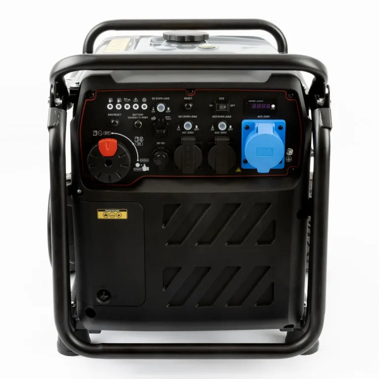 Aggregaatin ohjauspaneelista löytyy matalan bensiini-, kaasu- ja öljytason merkkivalot, ylikuormituksen ja käynnistysvalmiuden merkkivalot, sähkökäynnistys ja rikastin-toiminnon säätönuppi, palautuspainikkeet, akun latausportti, tasavirtaylikuormitussuojan painike, ON/OFF-kytkin energiansäästötilalle, 1 x USB-C-liitäntä, 1 x 12 V ulosotto, 2 x 230 V 16 A ulosottoja omilla ylikuormitussuojilla, näyttö jännitteen, taajuuden ja kokonaiskäyttöajan tarkasteluun, 1 x 230 V 32 A ulosotto ja maadoituspiste.