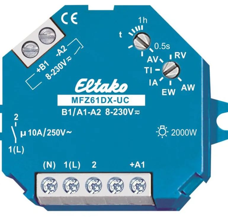 Aikarele, jossa Eltakon Duplex-teknologia (DX), Normaalisti potentiaalivapaat koskettimet voidaan silti kytkeä nollapisteessä 230 V AC 50 Hz ja vähentää siten merkittävästi niiden kulumista. Liitä tätä varten nollajohdin liittimeen (N) ja L liittimeen 1 (L). Hybriditeknologia, jossa yhdistyvät kulutusta kestävä elektroninen ohjaus ja suorituskykyinen erikoisrele. Käyttämällä bistabiilia reletoimintoa vältetään tehonmenetys ja lämmöntuotanto, vaikka rele on toiminnassa. Aika-asetukset säädettävissä 0,5 sekunnista 1 tuntiin.