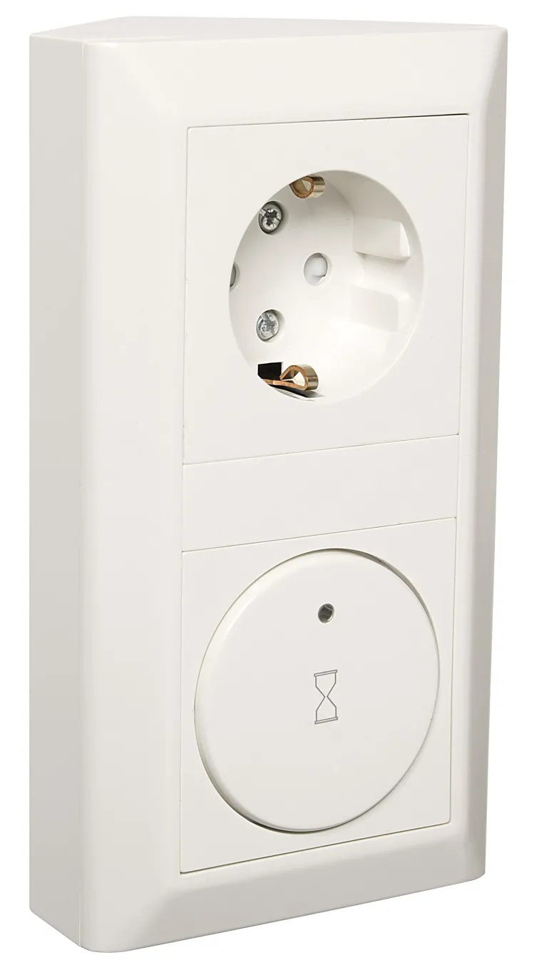 Kulmakotelo 1-osaisella pistorasialla ja ajastin 2-napaisella releellä 10A/230V 15 min – 8 h ruuviliitännällä pinta-asennusta varten. Ajastin 18 979 60 ja 1-osainen maadoitettu pistorasia.