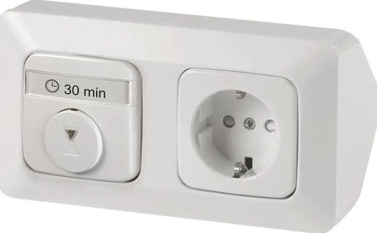 Ajastinsarja: Jussi-sarjan perusajastin, yksiosainen pistorasia ja kulmakotelo, pinta-asennus. 2-napainen ajastin sähkölaitteiden kätevään ajanhallintaan.