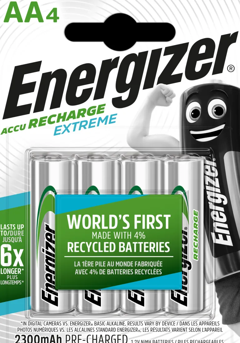 Energizer Recharge Extreme on ladattava 1,2 V AA-paisto, joka on valmistettu 4 % kierrätetyistä paristoista, mikä vähentää ympäristövaikutuksia. Paristo toimii jopa 4 kertaa pidempään digitaalikameroissa verrattuna tavallisiin Energizer-alkaliparistoihin. Recharge Extreme -pariston käyttöikä on jopa 5 vuotta tyypillisissä käyttötavoissa. Toimitetaan 4 kpl:n pakkauksessa.