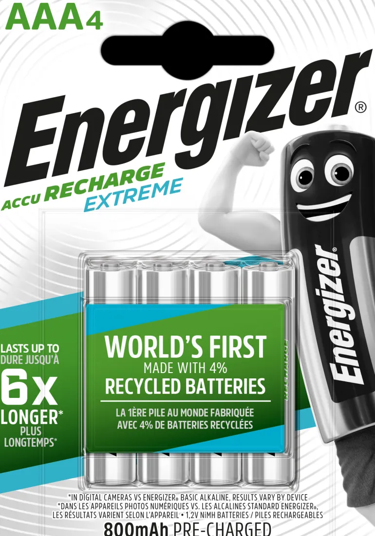 Energizer Recharge Extreme on ladattava 1,2 V AAA-paisto, joka on valmistettu 4 % kierrätetyistä paristoista, mikä vähentää ympäristövaikutuksia. Paristo toimii jopa 4 kertaa pidempään digitaalikameroissa verrattuna tavallisiin Energizer-alkaliparistoihin. Recharge Extreme -pariston käyttöikä on jopa 5 vuotta tyypillisissä käyttötavoissa. Toimitetaan 4 kpl:n pakkauksessa.