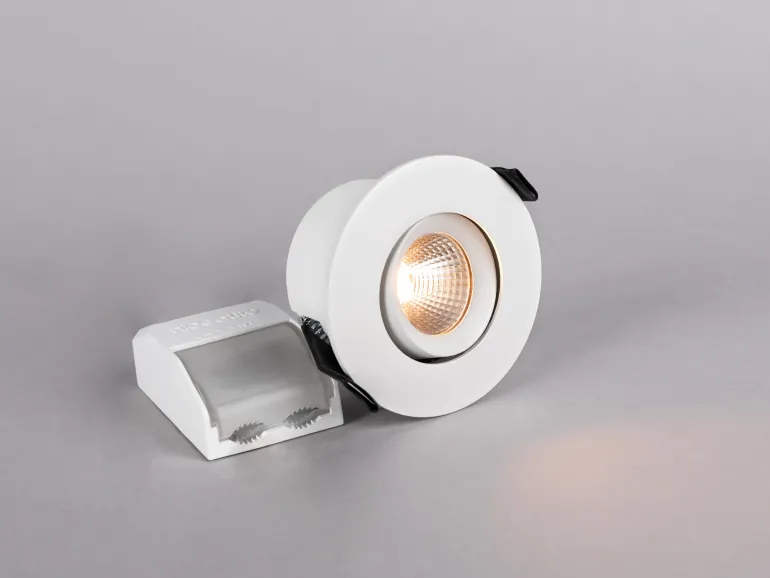 Matalarakenteinen, suunnattava alasvalo, sopii asennettavaksi 28 mm harvalaudoitukseen ja hyväksytty asennettavaksi suoraan eristettä vasten. Asennusaukko 55-63 mm – täydellinen vanhojen halogeenivalojen korvaaja jälkiasennuksessa. Heijastintekniikka, häikäisemätön valokuvio, erittäin hyvä värintoisto, Ra>95. IP44-malli sisä- ja ulkoasennukseen. Vaihehimmennettävä ohjain helppoon 230 V asennukseen, 3-napainen ketjutusliitin sekä vedonpoisto ilman ruuvia. Himmennettävissä markkinoiden tavallisimmilla himmentimillä.