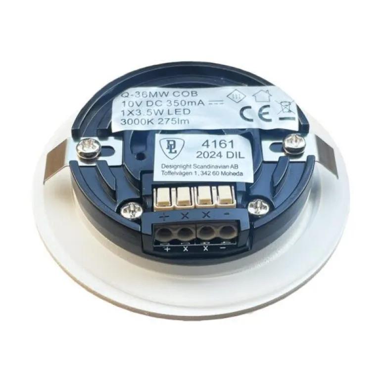 Huom. Kun vaihdat esimerkiksi halogeenista, sinun on myös vaihdettava liitäntälaite. Valaisin on ketjutettava vakiovirtaohjattuun liitäntälaitteeseen. Takapuolella pikaliittimet + ja – sekä xx, jota voidaan käyttää miinusjohtimen johtamiseen takaisin liitäntälaitteeseen.
