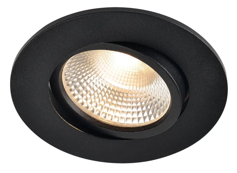 Musta suunnattava alasvalo (IP65-luokiteltu). Valaisin soveltuu erityisesti kosteisiin tiloihin, rakennusten ulkopinnoille, räystäisiin, harvalaudoituksiin ja terassien kattorakenteisiin.
