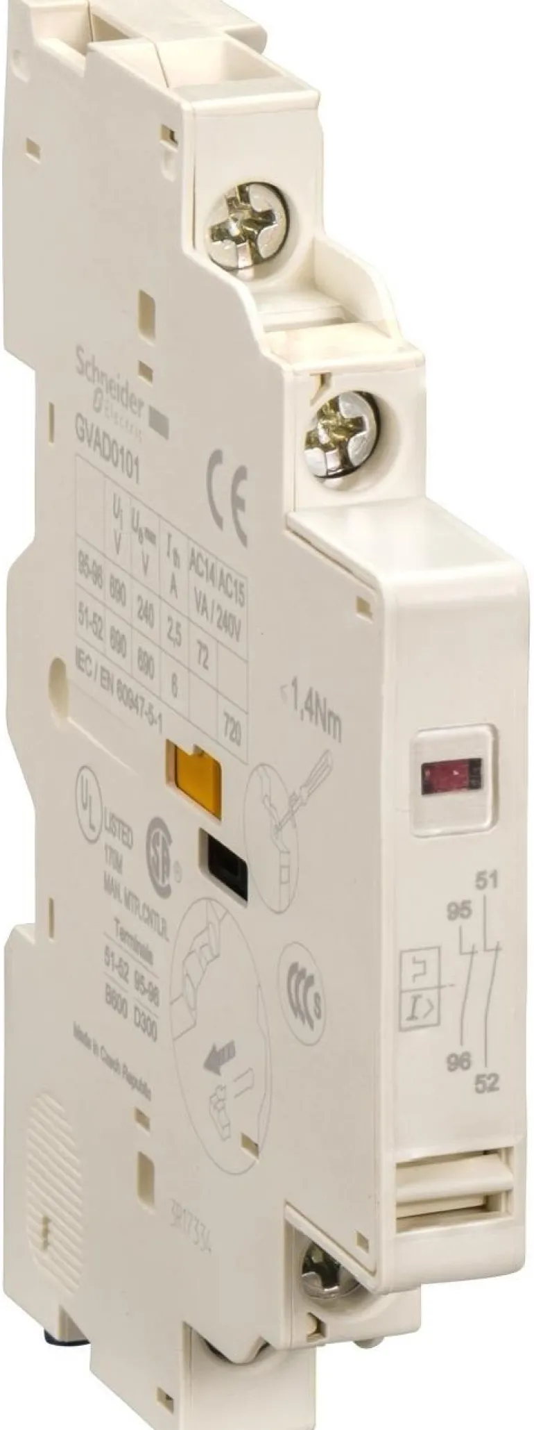 Sivulle asennettava apukosketinlohko. Enintään 1 etuosaan asennettava ja 2 sivulle asennettavaa lohkoa GV-kytkintä kohden.
