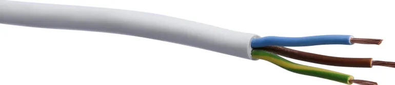 Valkoinen asennuskaapeli 5 m, pyöreä poikkileikkaus. Siirrettäviin käyttöesineisiin asuin-ja toimistotiloissa sekä muissa kuivissa sisätiloissa.