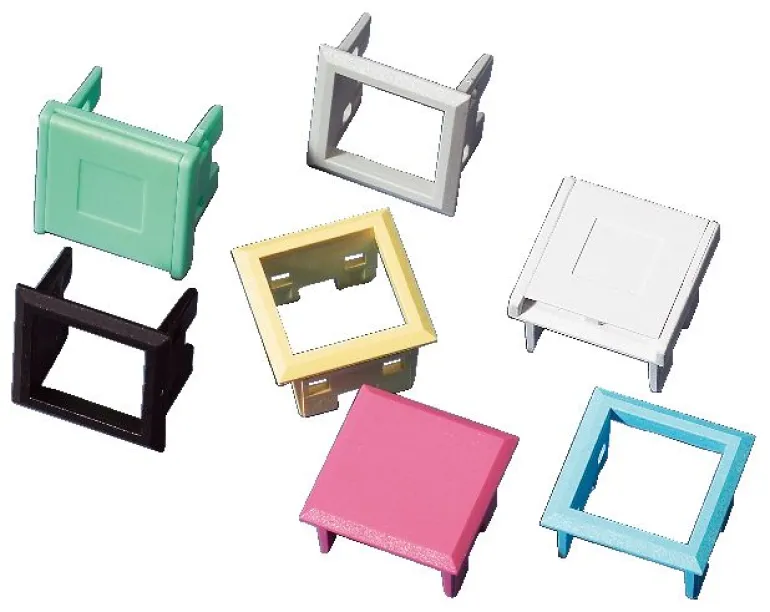 Pölykannellinen asennuskehys LexCom RJ45 -liittimelle. Kehys asennetaan keskiölevyihin, joissa on LexCom-reikäkuvio. Pölyltä suojautumisen lisäksi pistorasiaan voidaan merkitä linkkinumero pölysuojuksen ulkopuolelle tai sisälle. Katso merkintä otsikosta Pistorasioiden merkintä.