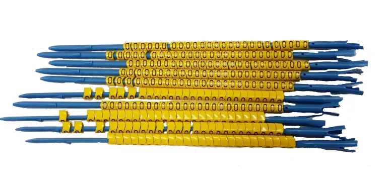 Keltaisella merkinnällä varustettu asennustyökalu, sininen puikko. PA1-merkeillä varustettu asennuspuikko kaapelin pinta-alalle 1,5–4,0 mm². Valmis merkintäsarja asennustikulla 0–9 kokoa PA1 varten.