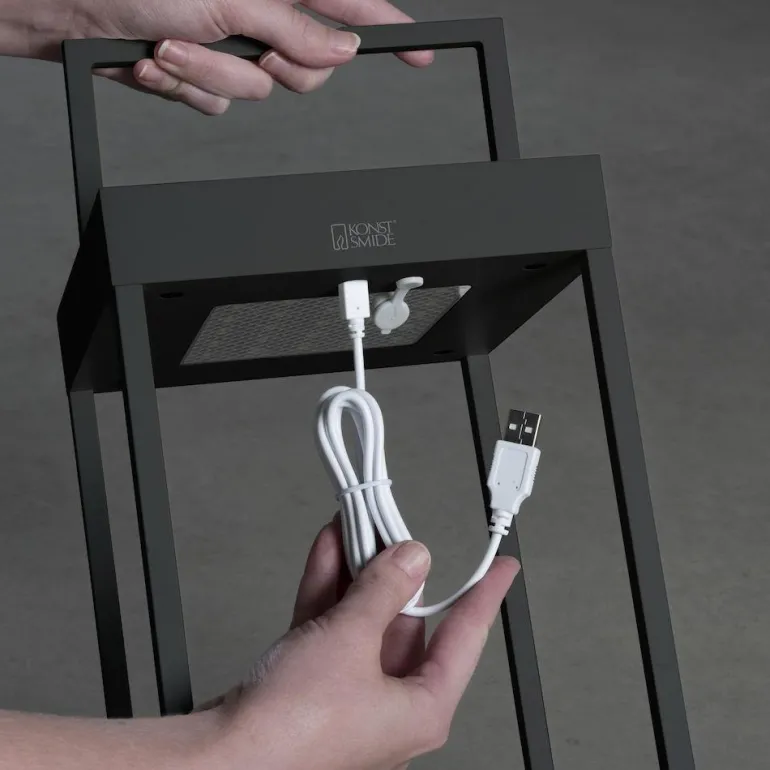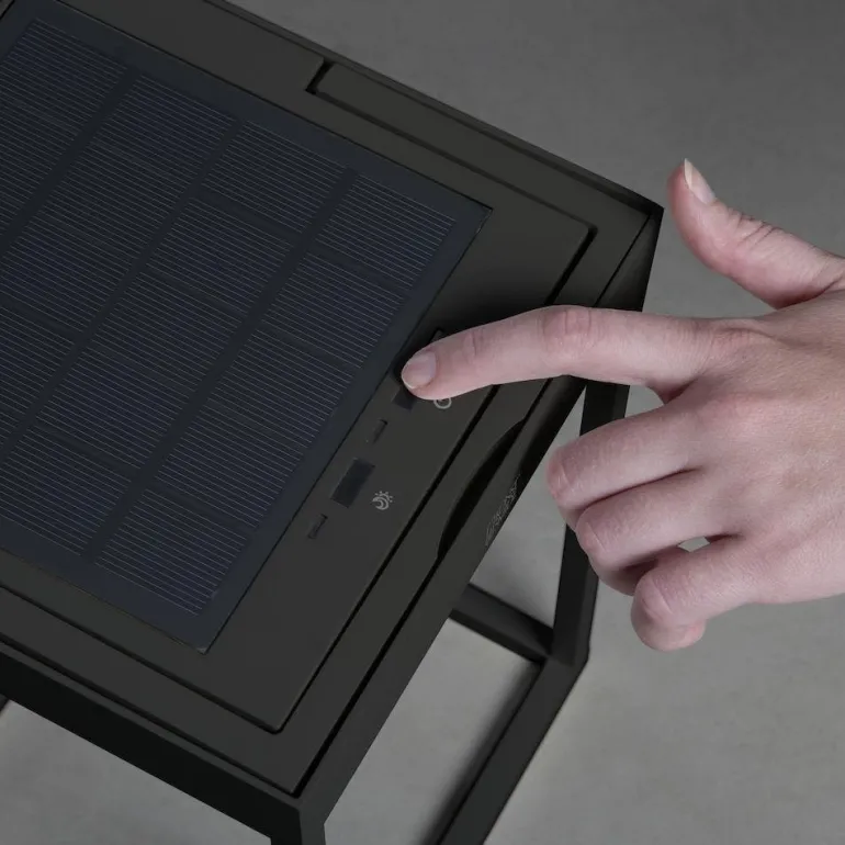 Konstsmide USB Touch 7815-750 Portofino on musta alumiininen aurinkokennolyhtyvalaisin ulkokäyttöön. Latautuu aurinkokennoilla, voidaan ladata myös USB:llä. Valaisimen muotoilu on minimalistinen ja tyylikäs. Moderni valaisin, joka voidaan asentaa seinälle tai käyttää vapaasti seisovana. Valaisimessa on sisäänrakennettu himmennin, jossa on virta- ja hämäräkytkin. Värilämpötila on 2 700 K / 3 000 K.