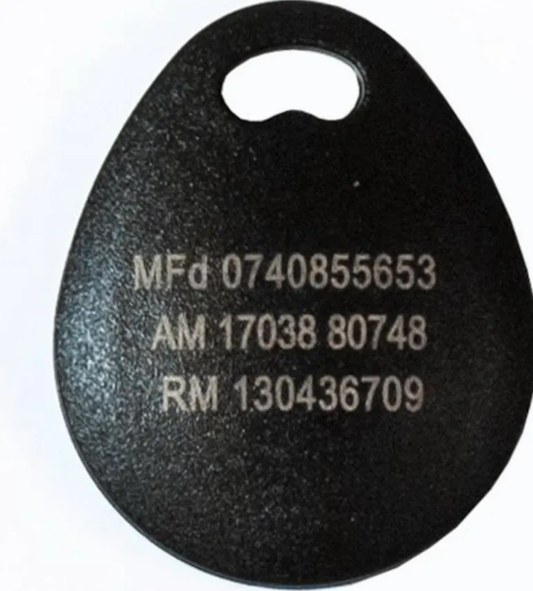 Kosketukseton Mifare-avaimenperä, jossa on laserkaiverretut numerot. (MfD) ASSA. (AM) Axema (RM) RCO. Mifare-tunnisteissa käytetään Mifare classic original-chip -sirua. Mustissa tunnisteissa ei ole yrityksen logoa.