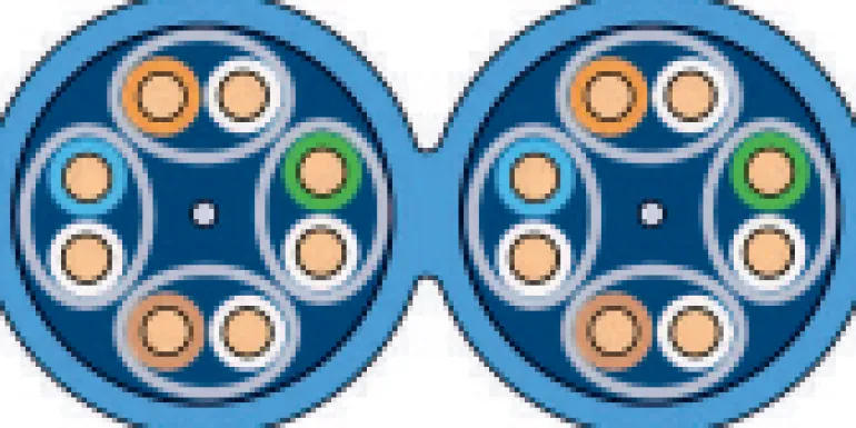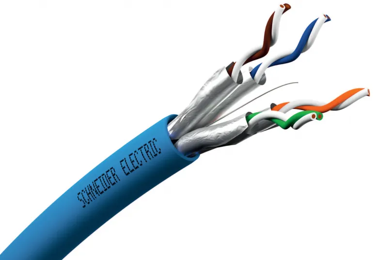 Suojattu Kat6 U/FTP -datakaapeli 4xAWG23 (300 MHz) sisäkäyttöön jakeluverkoissa. Kaapelissa on sininen halogeeniton ulkovaippa Dca s2d2a1 ja kaapeliin on painettu metriasteikko.