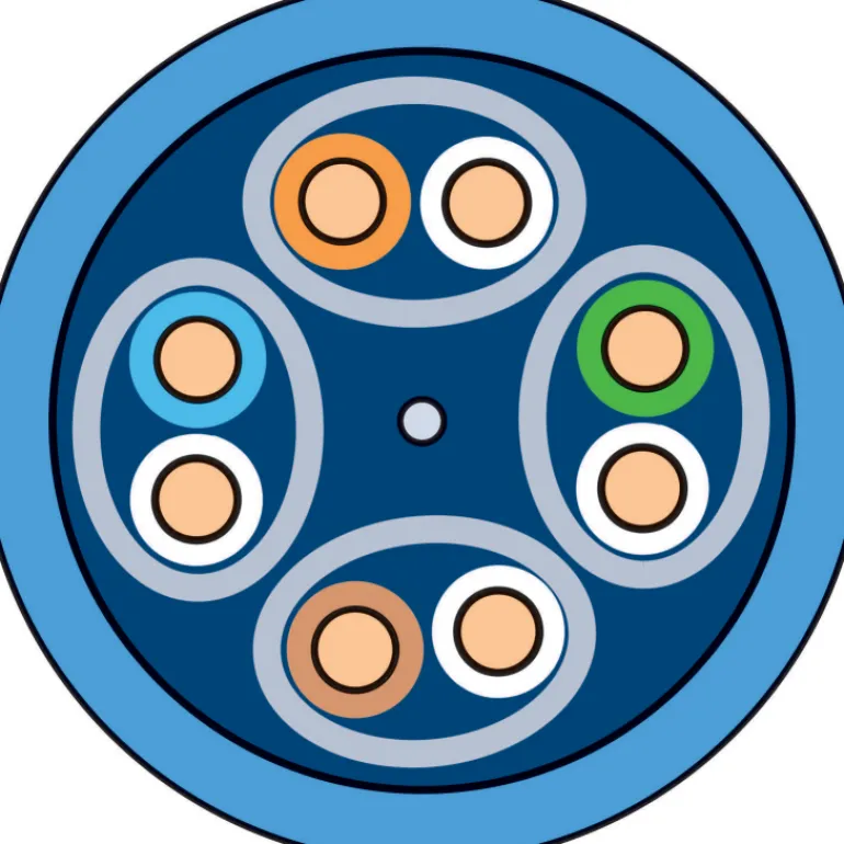 Suojattu Kat6A U/FTP -datakaapeli 4xAWG23 (550 MHz) sisäkäyttöön jakeluverkoissa. Kaapelissa on sininen halogeeniton ulkovaippa Dca s2d2a1 ja kaapeliin on painettu metriasteikko.