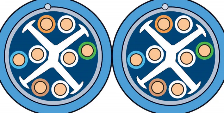 Suojattu Kat6A F-UTP -datakaapeli 4xAWG23 (550 MHz) sisäkäyttöön jakeluverkoissa. Kaapelissa on sininen halogeeniton ulkovaippa Dca s2d1a1 ja kaapeliin on painettu metriasteikko.