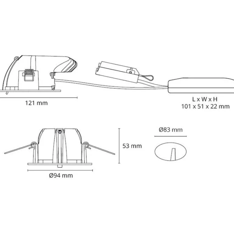 Käännettävä 9 W:n syväsäteilyvalaisin, jonka käyttöikä on 100 000 tuntia ja värilämpötila 2700 K. Valovirta 720 lm, ei-vaihdettava LED-valonlähde tuottaa hajontakulman 42°. Syväsäteilyvalaisimen mitat ovat 121 x 94 x 55 mm (P x L x K) ja reiän halkaisija 83 mm.