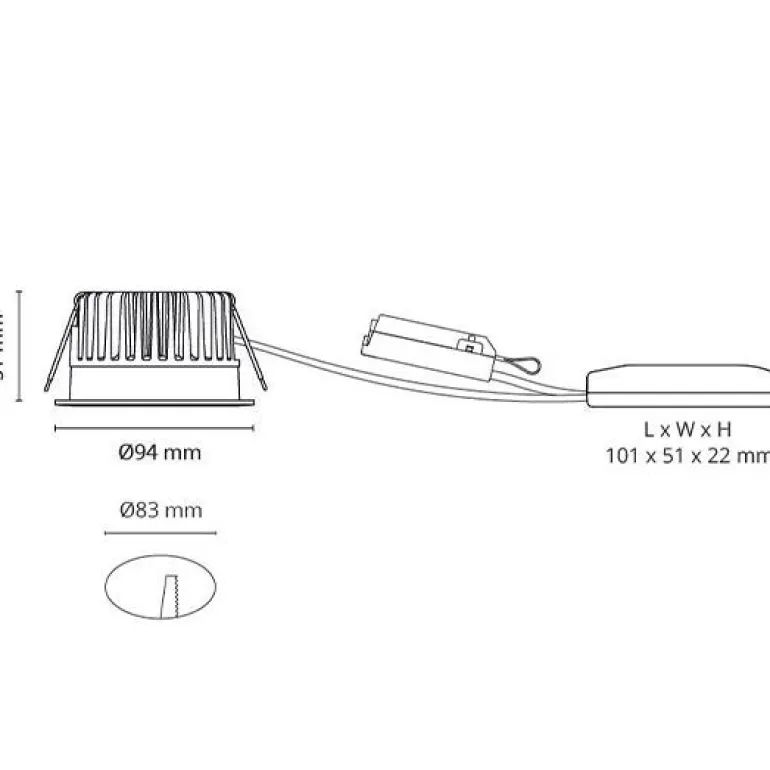 6W:n syväsäteilyvalaisin, värilämpötila 2000-2800K, 50 000 tunnin käyttöikä. Tuottaa 530 lm:n valovirran, sirontakulma 42°. Himmennettävä syväsäteilyvalaisin, energialuokka A++, uppoasennus sisä- tai ulkotiloihin. Asennussyvyys 51 mm ja halkaisija 94 mm.