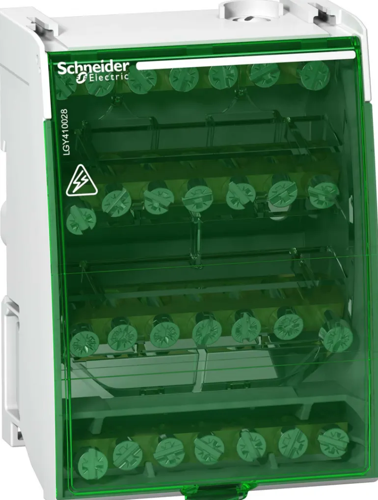 Schneider Electric LGY410028 -haaroitin 4P 100 A 4×7-liitännöille. Pehmeä johdin 2×1,5-16 mm2 + 5×1,5-10 mm2.