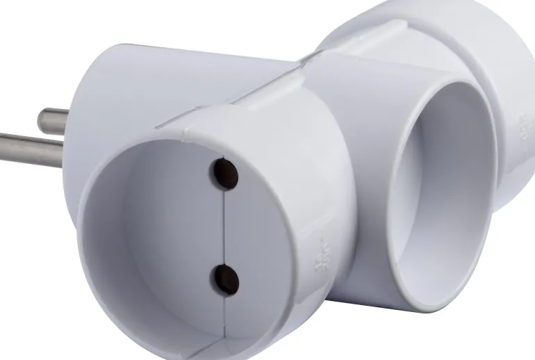 Valkoinen muovista valmistettu haaroitin 3:lla maadoittamattomalla pistorasialla.