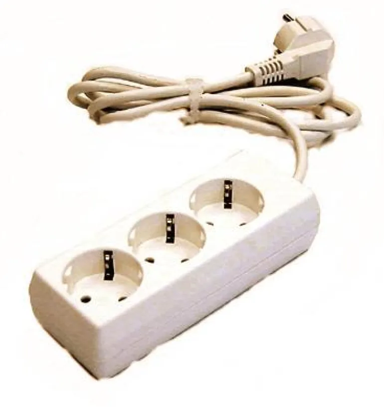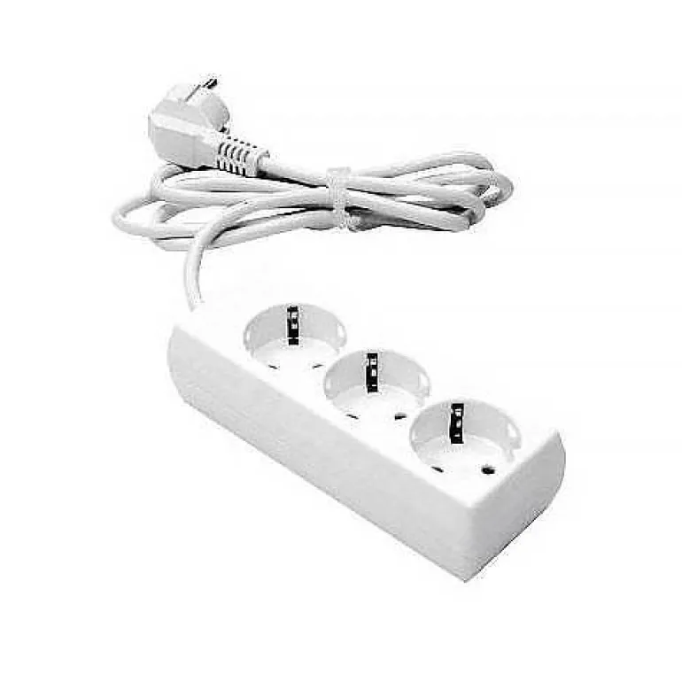 Valkoinen 3-osainen haaroitusjatkojohto, joka on maadoitettu ja varustettu 3 metrin johdolla. Sisätilakäyttöön.