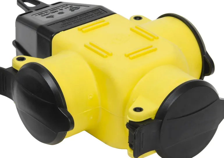Haaroituspistorasia, jossa on itsesulkeutuva kansi ja ripustuslenkki. Mallissa on 3 maadoitettua pistorasiaa ja keltainen/musta väri.