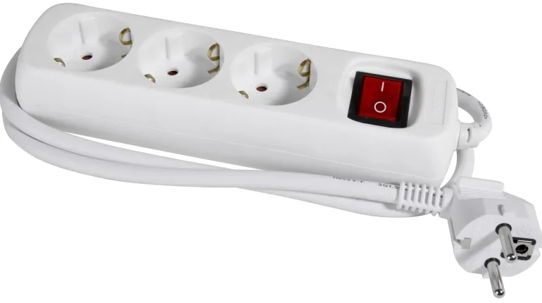 Haaroitusjatkojohto 2-napaisella katkaisimella ja 3 maadoitetulla viistoon asetetulla pistorasialla. Johto 1,4 metriä ja johtimen pinta-ala 1 mm².