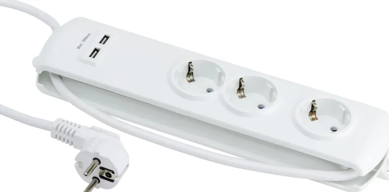 100-230 V haaroitusjatkojohto, jossa on 3 maadoitettua pistorasiaa, joista toisessa on hieman enemmän tilaa esim. adapterille/muuntajalle. Lisäksi se on varustettu 2 USB-pistokkeella USB-yhteensopivien laitteiden, kuten matkapuhelinten, tablettien, kameroiden, GPS:n jne. lataamiseen. Takana on kaksi reikää
