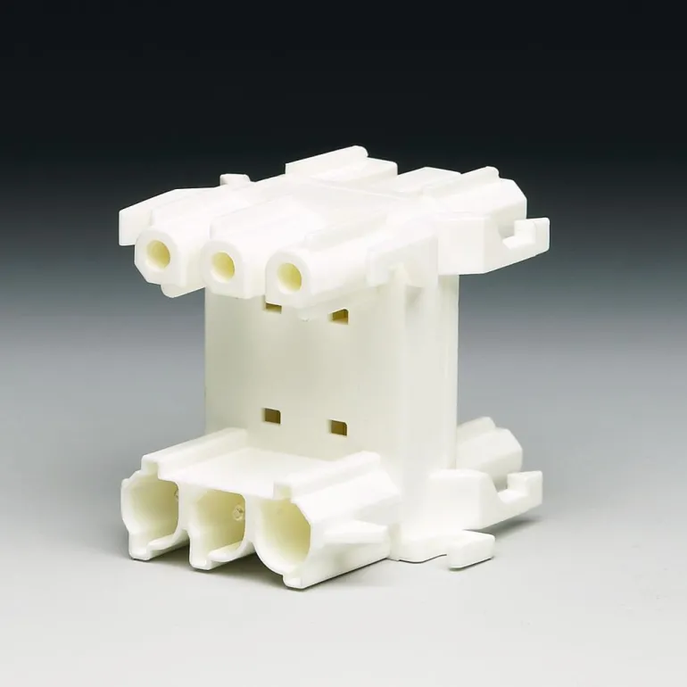 Haaroitusliitin sisältää holkkiliittimen syötön ja kolme pistotulpan ulostuloa. Haaroittimeen liitetyt koskettimet on määritelty kytkentäkaaviossa. Tarvittaessa liitäntälaite voidaan asentaa alustalle kahdella ruuvilla, max. ø 3,5 mm, kiinnitysreikien väli 58 mm.