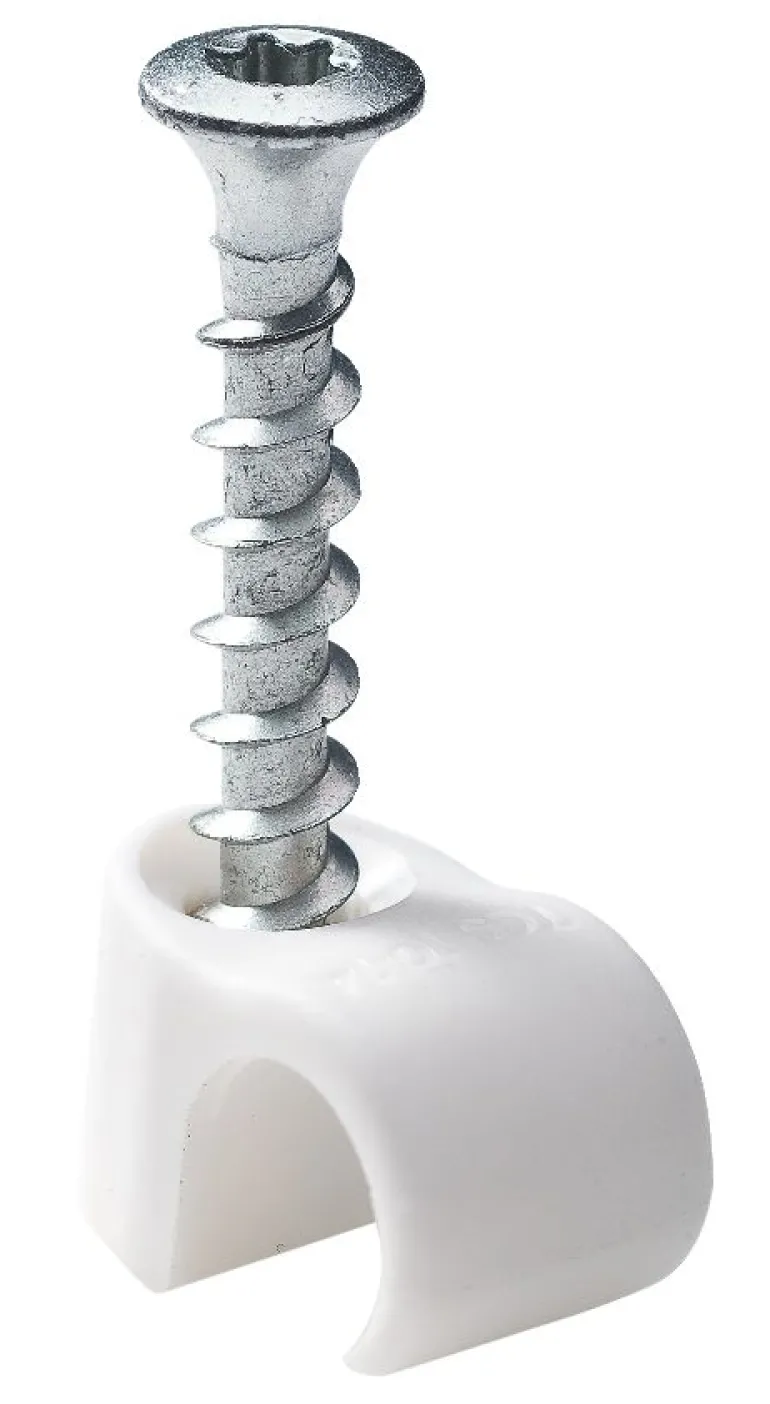 Kiinnittimet pyöreille kaapeleille, valmiiksi asennetut ruuvit, jotka on valmistettu karkaistusta teräksestä ja joissa on korroosioluokan C3 kestävä rauta/sinkkipinnoite. Vahva ruuvi terävällä kärjellä ja T20-uralla.