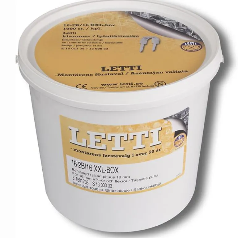 Letti 16-2B/16FR XXL Box on sähkösinkitty kaksijalkainen hakanen varmaan taipuisan putken kiinnitykseen. Hakanen soveltuu putkiin, joiden halkaisija on 16 mm. Karkaistut teräsnaulat 16 mm. Toimitetaan kotelossa, jossa on 1000 hakasta.