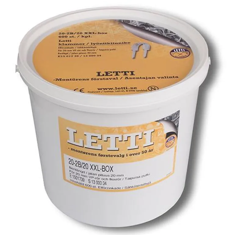 Letti 16-2B/16FR XXL Box on sähkösinkitty kaksijalkainen hakanen varmaan taipuisan putken kiinnitykseen. Hakanen soveltuu putkiin, joiden halkaisija on 20 mm. Karkaistut teräsnaulat 20 mm. Toimitetaan kotelossa, jossa on 600 hakasta.