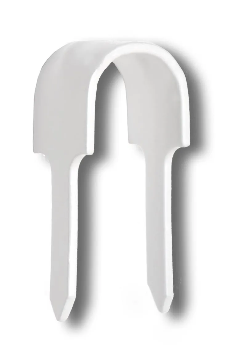 Sähkösinkitty kaksijalkainen hakanen kaapelien ja johtimien turvalliseen kiinnittämiseen, Rilsanplast-pinnoite. Rilsanplast on materiaali, joka kestää hyvin mineraalisuoloja, emäksiä, useimpia liuottimia ja orgaanisia happoja