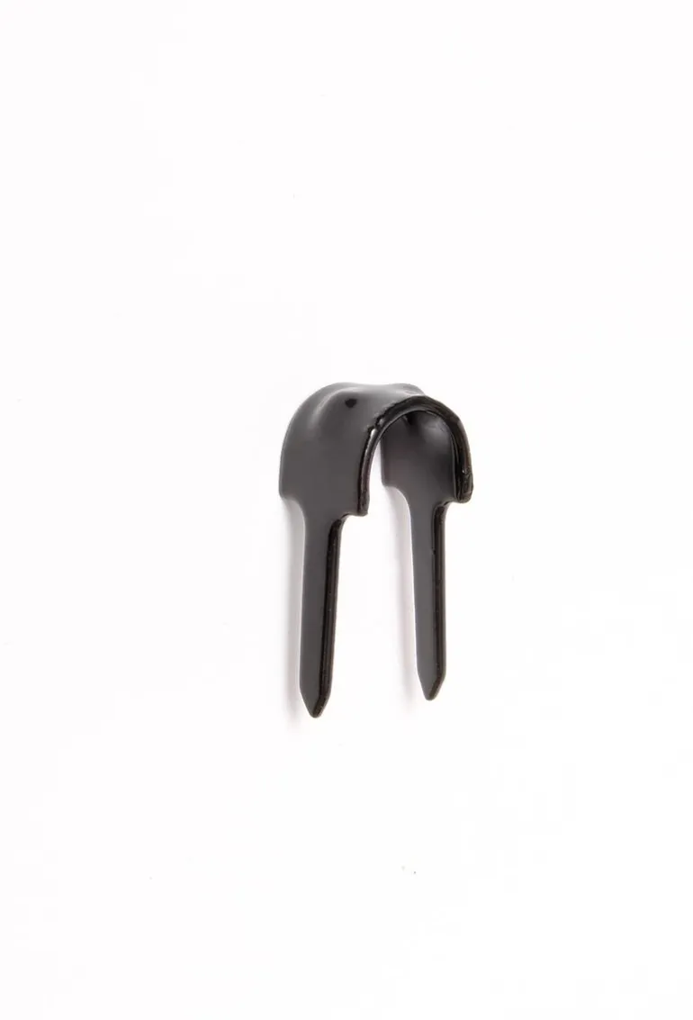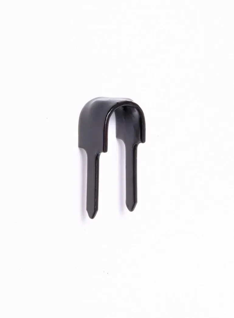 Sähkösinkitty kaksijalkainen hakanen kaapelien ja johtimien turvalliseen kiinnittämiseen, Rilsanplast-pinnoite. Rilsanplast on materiaali, joka kestää hyvin mineraalisuoloja, emäksiä, useimpia liuottimia ja orgaanisia happoja