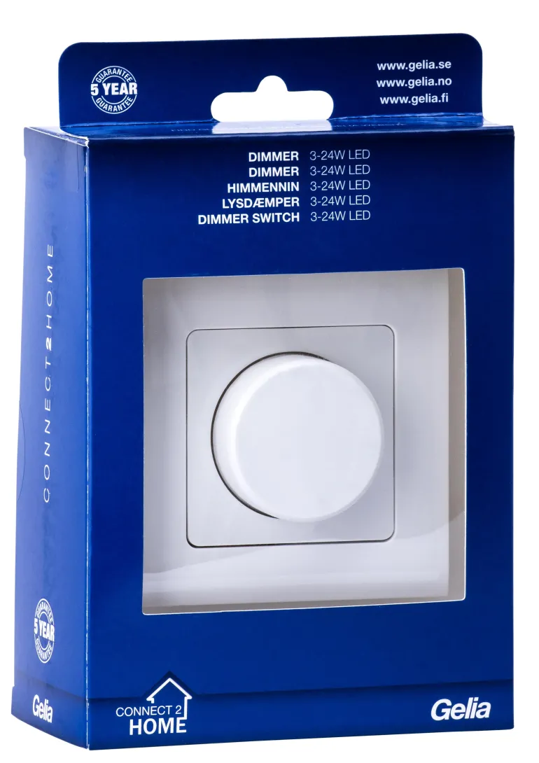 Himmennin takareunaohjauksella. Sisältää kiinnityskynnet, joita käytetään asennettaessa laite vanhempiin kokoonpanoihin, sekä kynsisarjan ruuveilla. Himmennin voidaan kytkeä LED 3-24 W:iin. Se soveltuu myös pienjännitteisille halogeenilampuille 30-200 W, hehkulampuille 30-200 W ja halogeenilampuille 30-200 W.