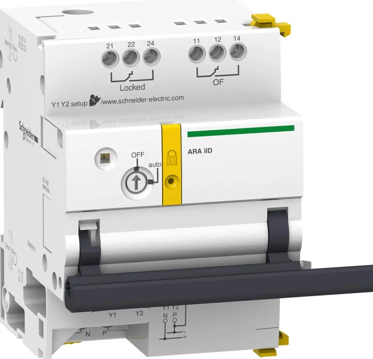 Schneider Electric Ara on automaattinen nollausmoduuli mikrokytkimille 63A asti ja vikavirtasuojille 100A asti, asennetaan vasemmalle puolelle. Riippuen käyttötarkoituksesta ja turvallisuusvaatimuksista, valitse ohjelma, joka sopii parhaiten tarkoitukseen. Jokaiselle tyypille on neljä erilaista ohjelmaa, yhdestä viiteen nollausyritykselle mikrokytkimille ja viisitoista vikavirtasuojalle. Ensimmäinen nollausyritys tehdään 60 sekunnin kuluttua. ARA:ssa on integroitu lisäkosketin OF sekä yksi, joka ilmaisee pysyvän sammutuksen.