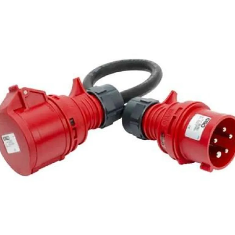 3-vaihejatkojohto 0,5 m, vaihekäännin, 400 V, 16 A. Hyväksytty ulkokäyttöön, suojausluokka IP44.