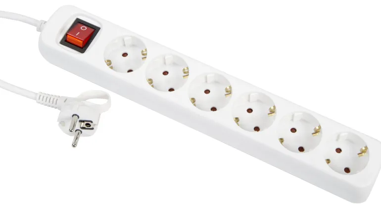 Jatkojohto 2-napaisella kytkimellä ja 6:lla maadoitetulla pistorasialla. Mallissa on vinoon asetetut pistorasiat (45° kulma), mikä antaa tilaa muuntajille.