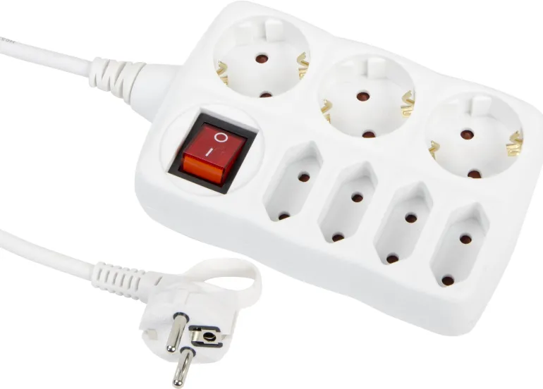 Jatkojohto kosketussuojalla ja 2-napaisella kytkimellä. Mallissa on 4 x europistorasiaa ja 3 x maadoitettua pistorasiaa. Valmistettu valkoisesta kestomuovista.