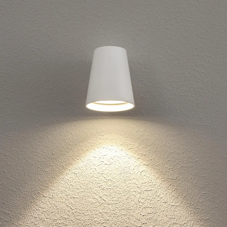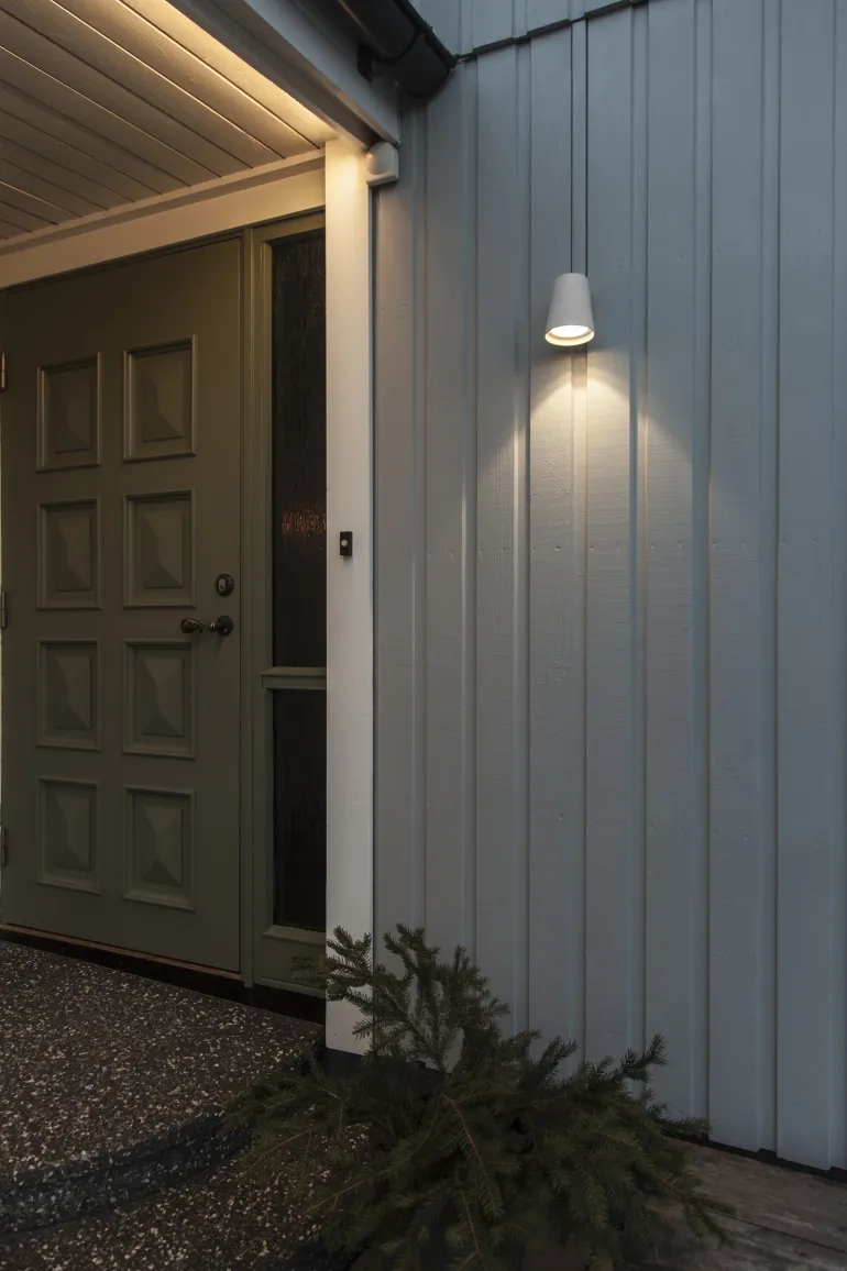 Tyylikäs kartiomainen julkisivuvalaisin. Heijastinoptiikka antaa epäsymmetrisen valokuvion, joka valaisee sekä seinää että maata.
