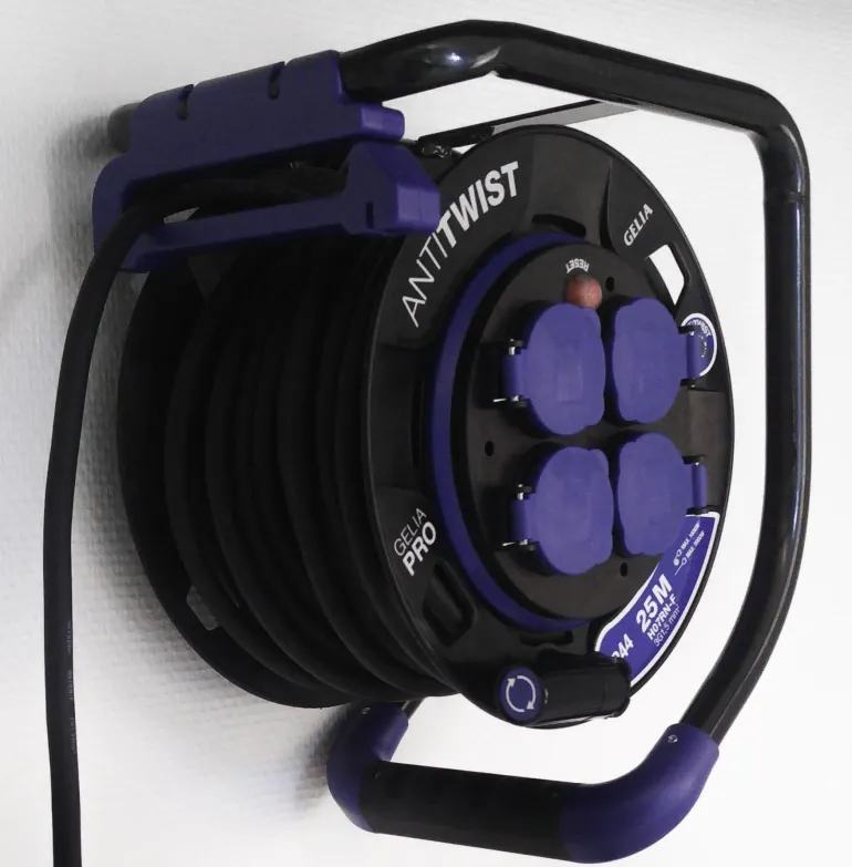 Maadoitettu 25 m:n kaapelikela, jossa on kiinteä anti-twist-napa ja itsesulkeutuva kansi. Kaapeli on öljynkestävä ja hyväksytty ulkokäyttöön.