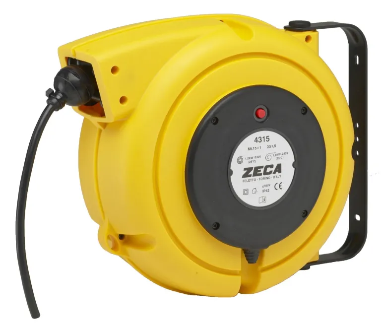 Palautusjousikela, jossa on iskunkestävä termoplastinen kansi ja ripustussanka, joka mahdollistaa 180°/310° kääntymisen kokoonpanosta riippuen. Kaapeli lukittuu automaattisesti 50 senttimetrin välein. Kaapelikelan pituus on 10 m ja se toimitetaan kaapelilla H07RN-F. Varustettu kolmella johtimella ja nollattavalla ylikuormitussuojalla.
