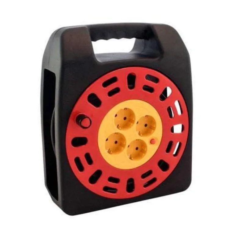 Kaapelikela, jossa on 4 maadoitettua pistorasiaa, väriyhdistelmä punainen/musta.