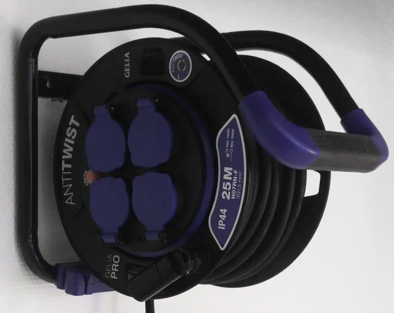 Maadoitettu 25 m:n kaapelikela, jossa on kiinteä anti-twist-napa ja itsesulkeutuva kansi. Kaapeli on öljynkestävä ja hyväksytty ulkokäyttöön.