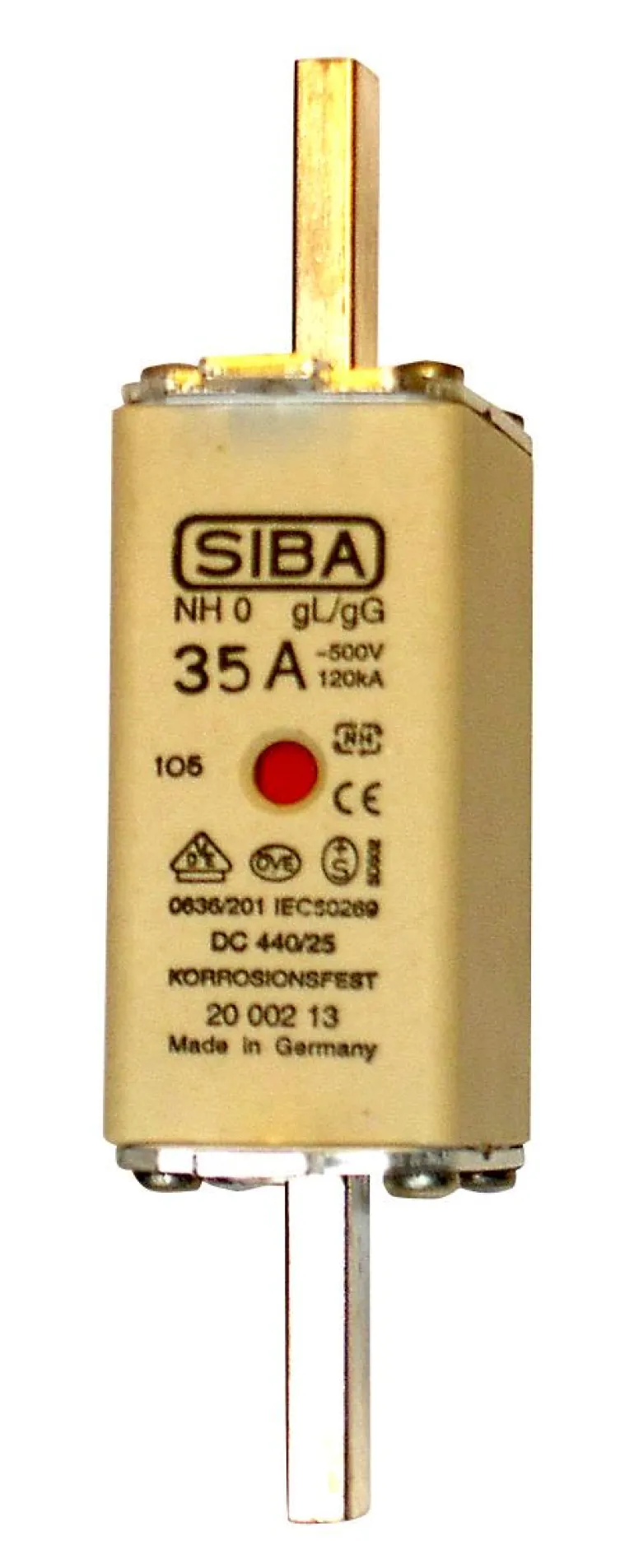 SIBA-kahvasulake, koko 0. Sulakkeen nimellisvirta on 200 A ja katkaisukyky 120 kA.