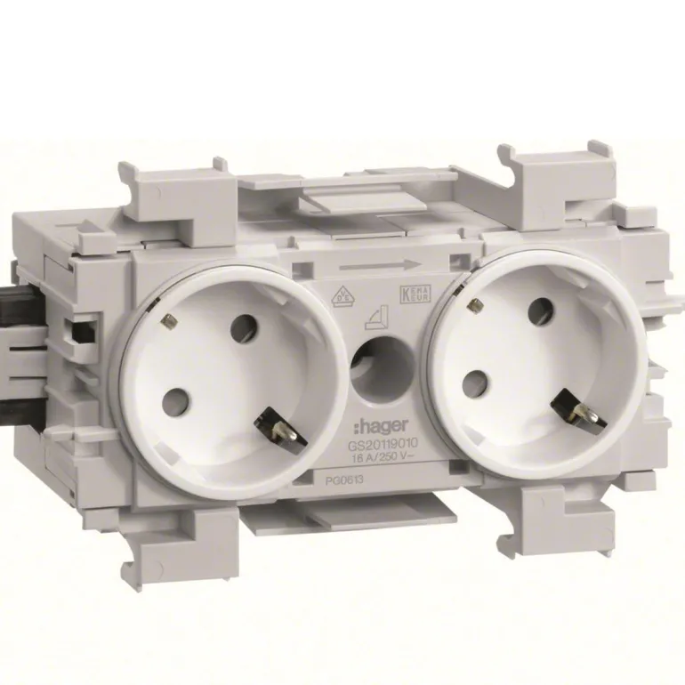 Hager GS20119016 on pistorasia 2-osainen 45° Wago-pikaliitt. (etureunakiinnitys, liikenteenvalkoinen). Kanavapistorasia pistorasiapesien kosketussuojilla, 45 astetta käännetyillä pistorasiapesillä, ketjutettavissa muiden kanavapistorasiamoduulien kanssa 3-napaisen pistokeliitinjärjestelmän ansiosta. Asennus helposti kanavaprofiilin etureunaan. Kaapeliliitäntä jousiliittimin 1,5 – 2,5 mm² tai pika-asenteisella pistoliitinratkaisulla.