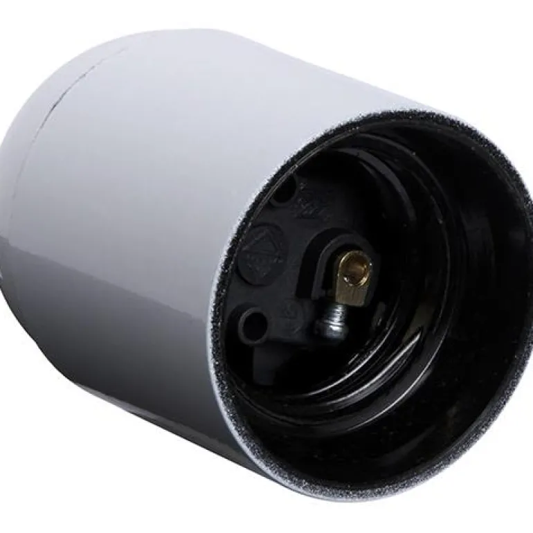 Sileä lampunpidike esimerkiksi pöytä- ja kattovalaisimille. Sisältää eristyssarjan ja jännitteenpoistajan. Ilman maapulttia.
