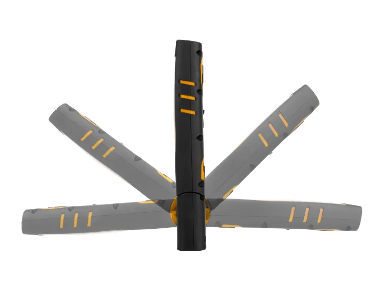 Taivutettu ladattava ledilamppu, musta-keltaista iskunkestävää ABS-muovia, erittäin vahvat magneetit, 2 takana ja 1 pohjalevyssä. 2 pyöritettävää koukkua.