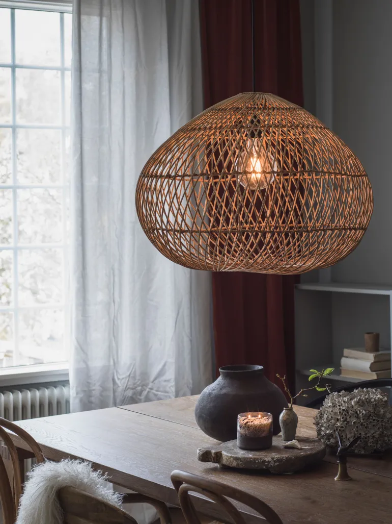 Karen on käsintehty kattovalaisin punotusta luonnonrottingista. Koska valaisin on valmistettu luonnonmateriaalista, voi kooissa esiintyä pieniä poikkeamia ja väri voi jokseenkin muuttua ajan myötä.