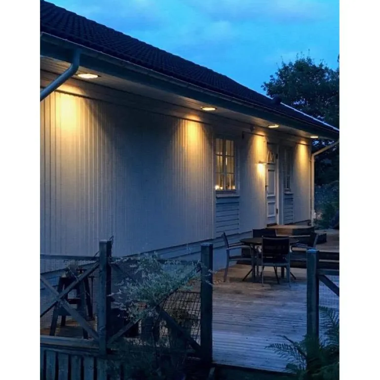 Kattovalaisin katoksen alle. Valaisimessa on E27-kanta. Kahdella tulo- ja lähtöliitännällä sekä pikaliittimellä. 250 x 250 x 155 mm (K x L x H).